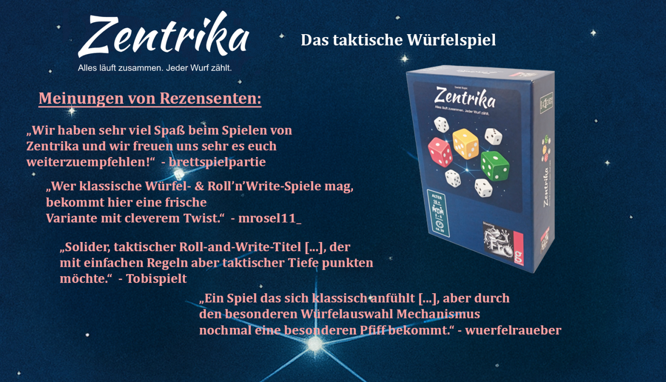 Wer ein herausforderndes taktisches Würfelspiel sucht, wird hier fündig. Keine Wartezeit. Jeder Wurf zählt. Alles läuft zusammen. Zentrika.